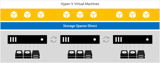 - S2D utiliza hardware estándar de la industria (servidores x86 con unidades locales SATA, SAS, NVMe). Esto reduce la dependencia de costosas implementaciones SAN y NAS con equipos dedicados.
