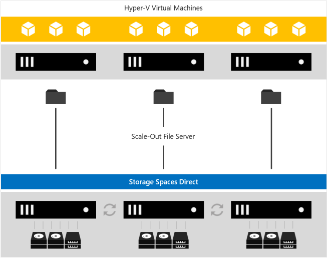 - S2D está construido sobre los cimientos del Clúster de Conmutación por Error de Windows Server. Los datos se distribuyen y se replican (mediante espejos de dos o tres vías, o paridad simple/doble) entre los diferentes discos y servidores del clúster.